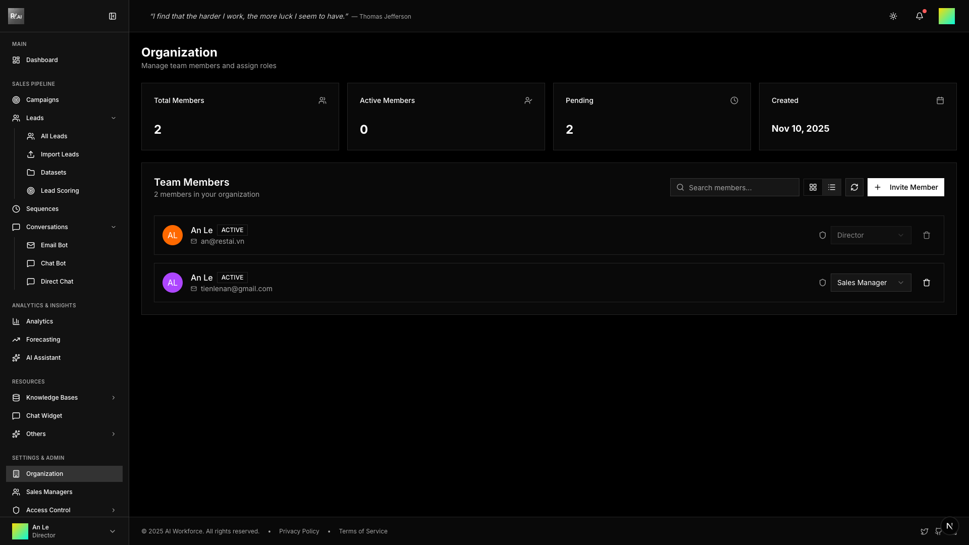When a new Sales Manager is created, 10 AI Agents are automatically generated and assigned to them. Admins and Directors can enable or disable agents for each Sales Manager. See AI Agents for details.