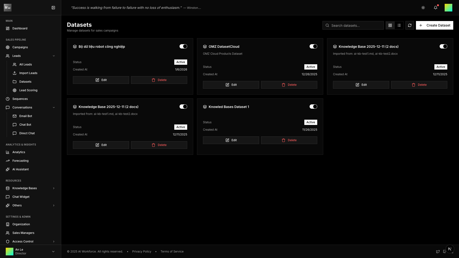 Use the switch on each dataset card to enable/disable it. Inactive datasets cannot be assigned to new campaigns.